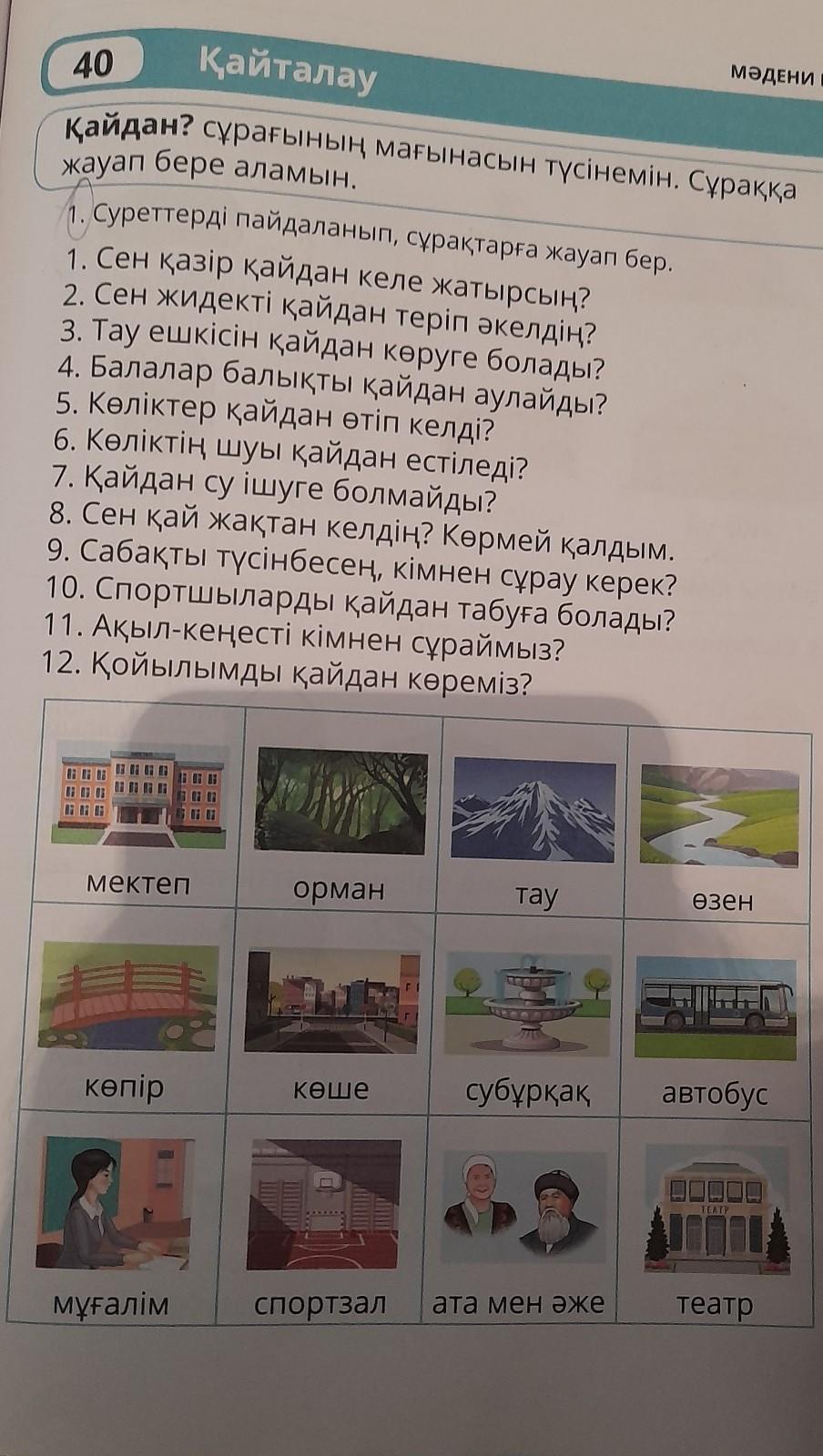 1. Мектептен, 2. орманнан, 3.таудан, 4. өзеннен, 5. көпірден, 6. көшеден, 7. субұрқақтан, 8. автобустан, 9. мұғалімнен, 10. спортзалдан, 11. ата мен әжеден, 12. театрдан