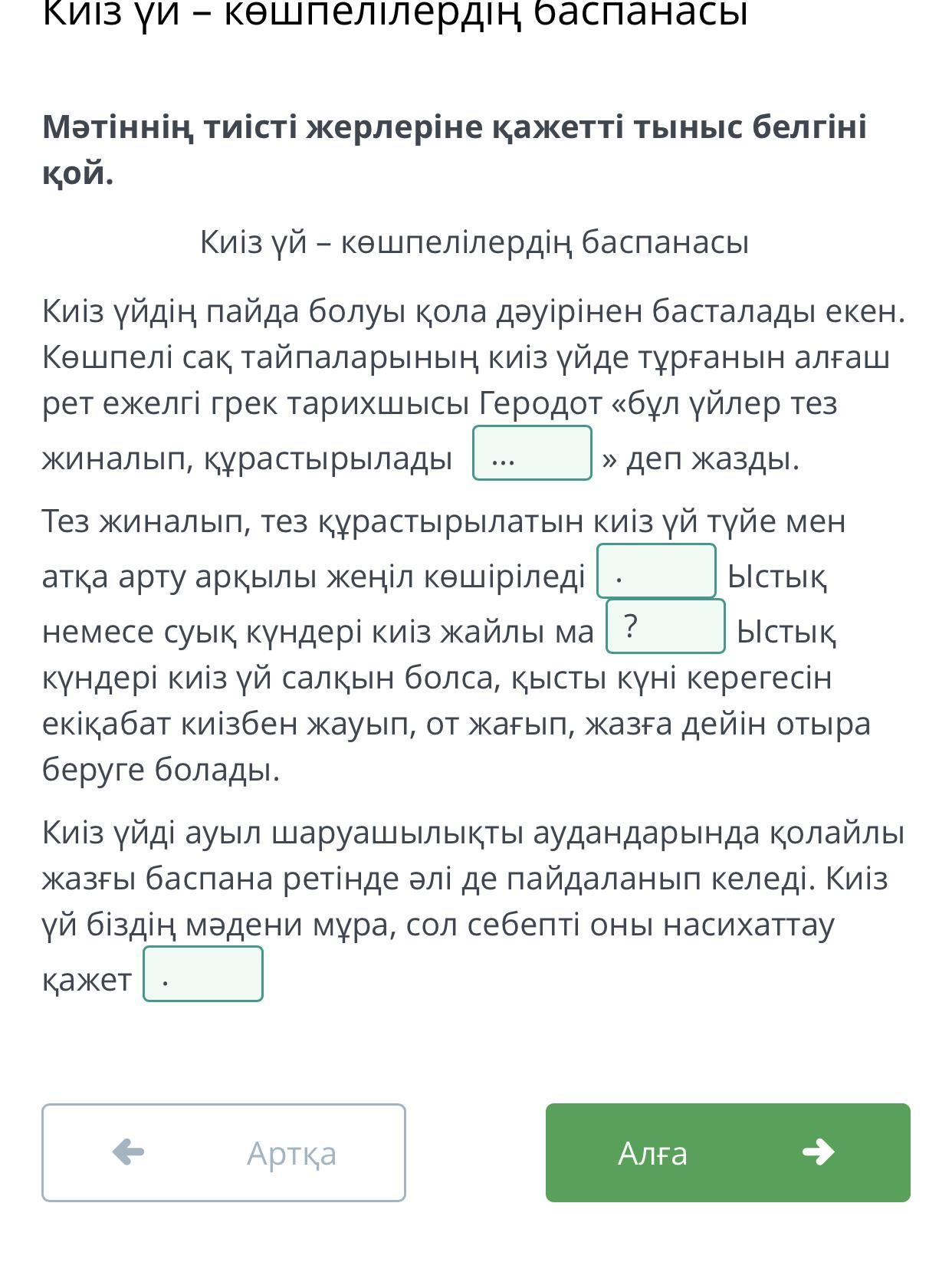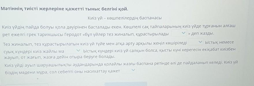 Мәтіннің тиісті жерлеріне қажетті тыныс белгіні қой.