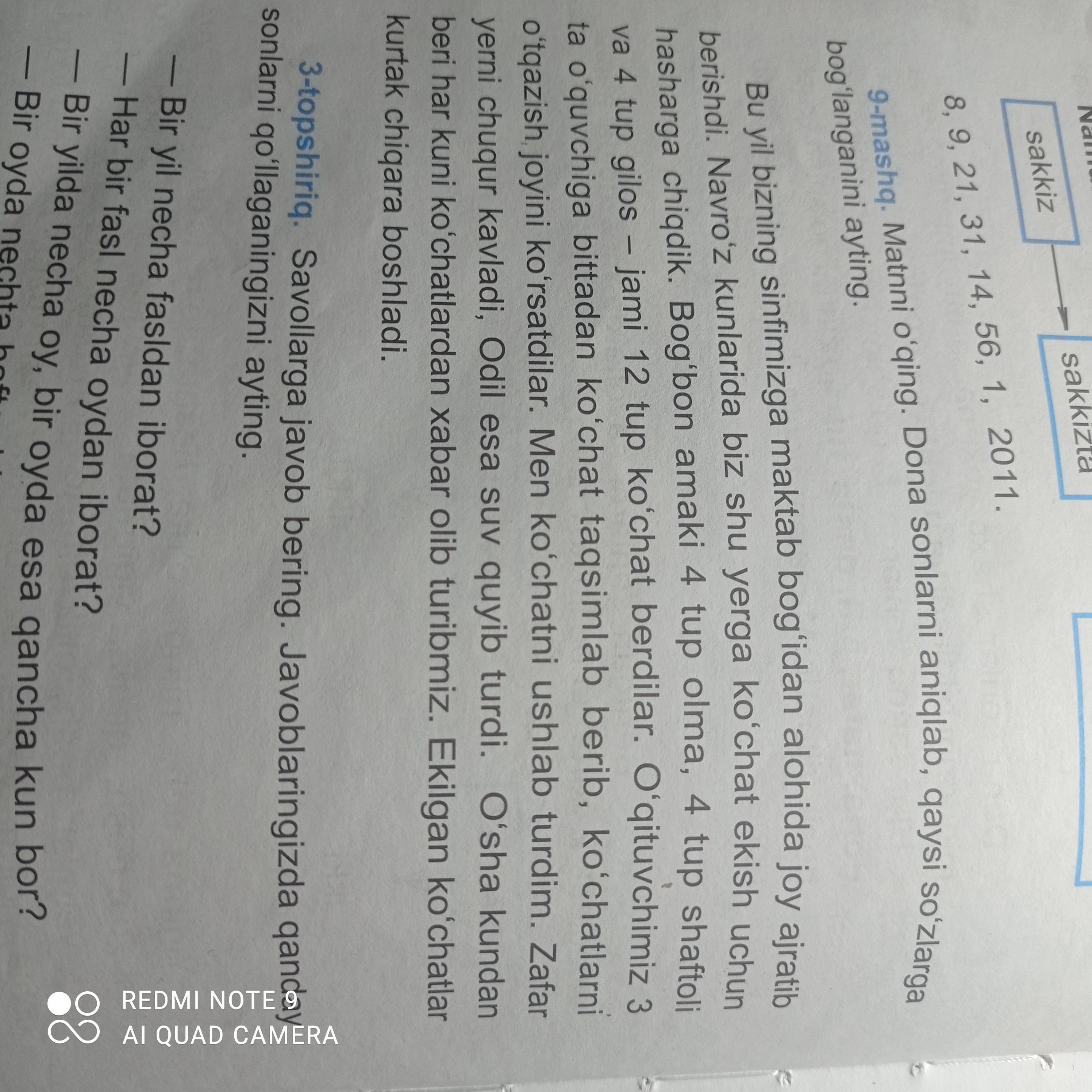 Dona sonlar: 4 tub olma, 4 tub shaftoli, 4 tub gilos, 12 tub ko'chat, 3 ta o'quvchiga.