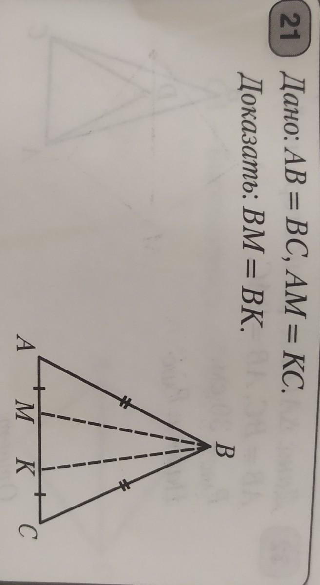 Значит треугольники равны по 2-м сторонам и углу между ними. Отсюда следует, что ВМ=КС