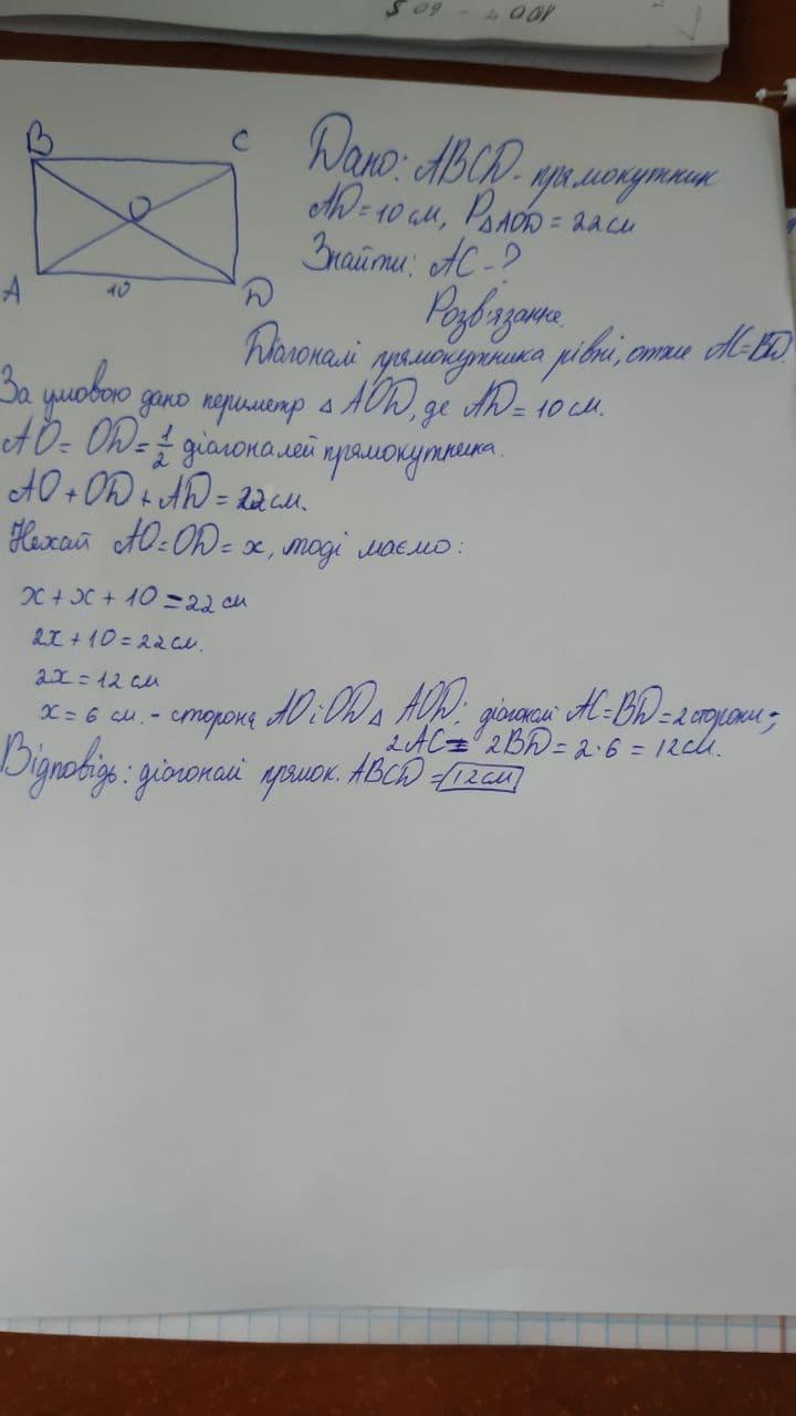 О- точка перетину діагоналей прямокутника ABCD Сторона AD дорівнює 10 см а периметр трикутника AOD 22 см Знайти довжину діагоналі прямокутника ABCD