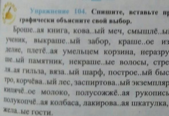 Ответ:Брошенная книга, коварный меч, смышлённый ученик, выкрашеный забор, крашеное изделие, плетёная умельцем корзина, неразрушеный памятник, некрашеные волосы, стреляная гильза, вязаный шарф, построенный быстро, корчёваный лес, заспиртованый экземпляр, кипячоное молоко, полусожжёная рукопись, полукопчёная колбаса, лакированая шкатулка, желанные гости.