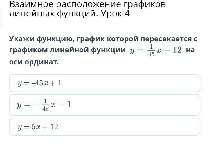 Укажи функцию, график которой пересекается с графиком линейной функции y=1/45 x+12 на оси ординат