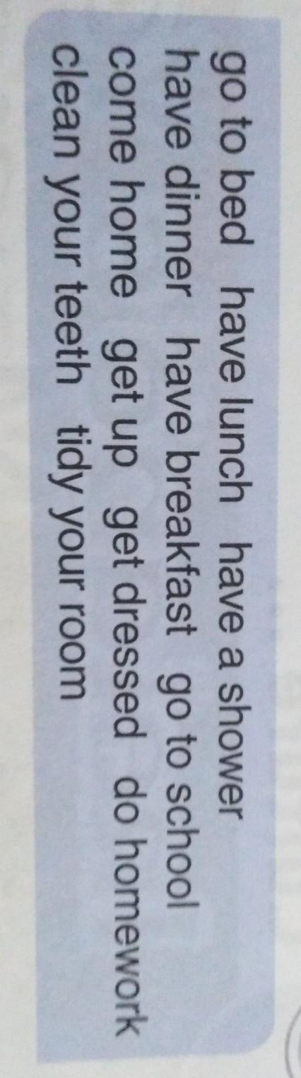Ответ:get up,get dressed,clean you’re teeth,have breakfast,go to school,have lunch,go home,have dinner,do your homework,have a shower,go to bed