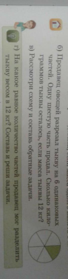 1) 12 : 6 * 1 = 2 ( кг ) - масса одной части тыквы
