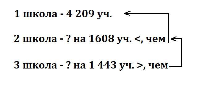 В первой школе 4209 учеников в другой на 1608 учеников меньше чем в первой а в третьей на 1443 ученика больше чем во второй сколько учеников в третьей школе?