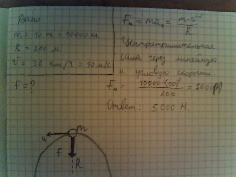 Трактор массой 10 т проходит по выпуклому мосту радиусом 200 м со скоростью 36 км/ч. Какова сила давления трактора на середину моста?