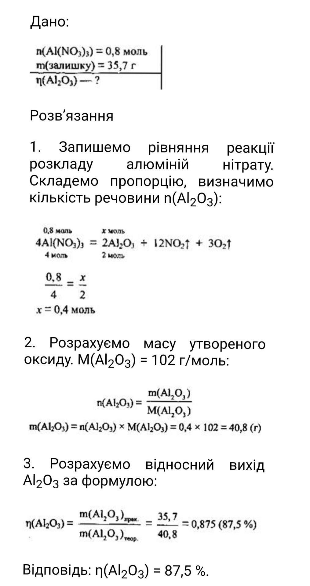 При повному термічному розкладанні 0,8 моль алюміній нітрату одержали 35,7 г твердого залишку. Обчисліть відносний вихід речовини(%), що міститься у твердому залишку.