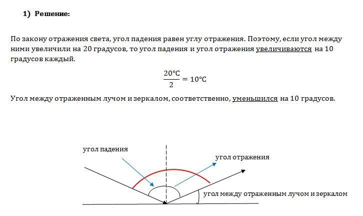 I Луч света падает на плоское зеркало. Угол между падающим лучом и отраженным увеличили на 20 градусов. Угол между зеркалом и отраженным лучом...