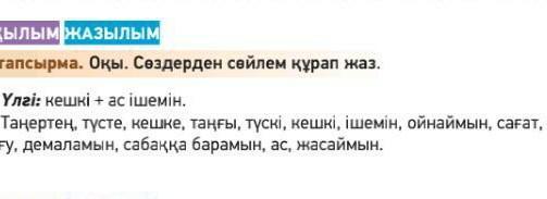 Мен таңертен сағат жетіде оянамын. Содан кейін таңғы ас ішемін де сабаққа дайындаламын. Түсте мектепке барап ол жерде 6 сағат боламын. Мен кешкі алтыда үйге келемінде мұғалім берген үй тапсырмаларды жасаймын. Мен демалыс күндері демаламын немесе далаға шығып достарыммен ойнаймын. Сосын мен сағат онда ұйқыға кетем.