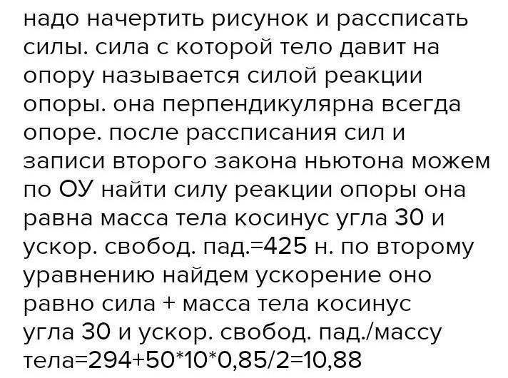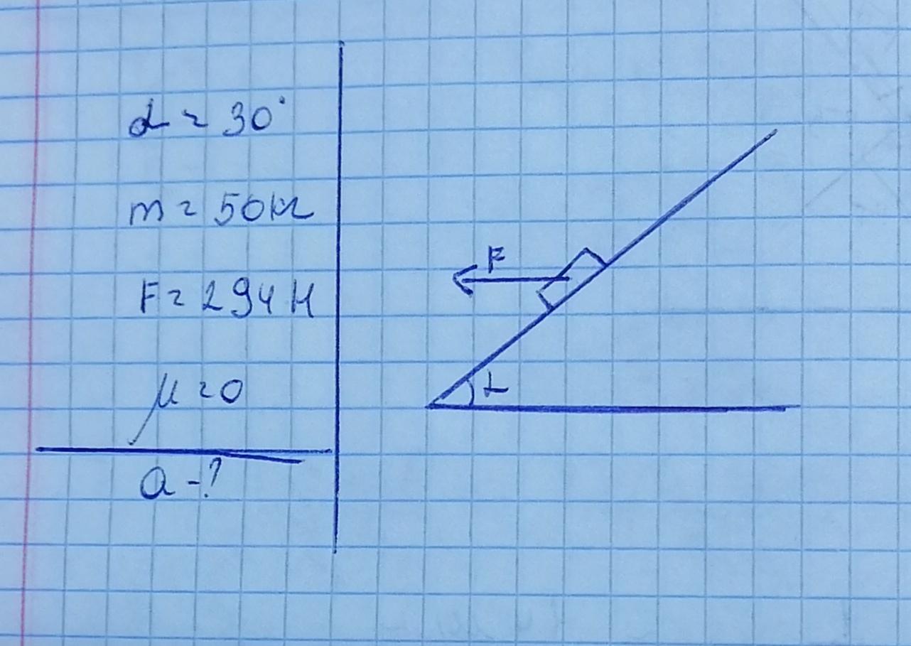 Рассчитать ускорение тело, масса которого равна 50 кг, скатывающигося с наклонной плоскости (без трение) , угол наклона 30 градусов. Сила действующая на тело равна 294Н и направленна горизонтально влево