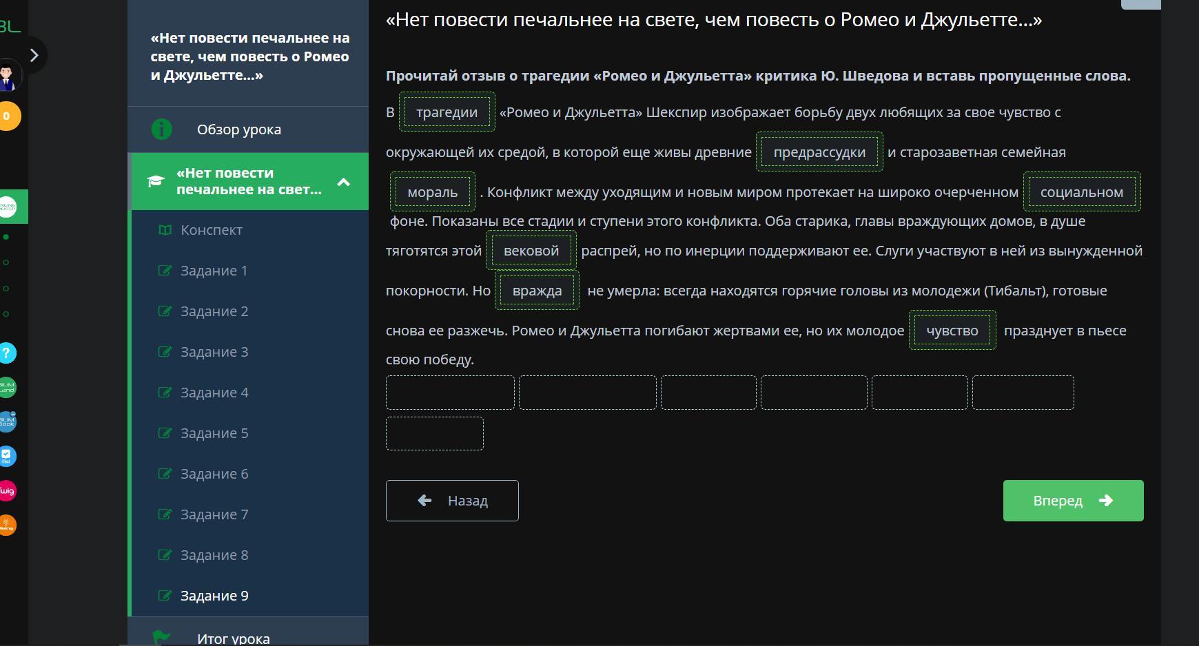 Прочитай отзыв о трагедии «Ромео и Джульетта» критика Ю. Шведова и вставь пропущенные слова.