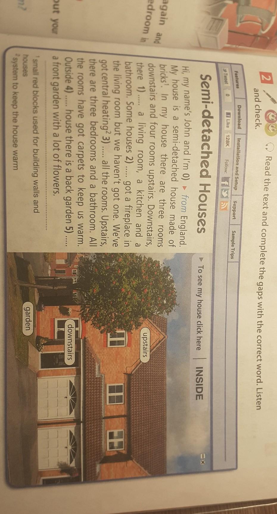 Hi, my name's John and I'm from England. My house is a semi-detached house made of bricks. In my house, there are three rooms downstairs and four rooms upstairs. Downstairs, there is a living room, a kitchen, and a bathroom. Some houses have got a fireplace in the living room but we haven't got one. We've got central heating in all the rooms. Upstairs, there are three bedrooms and a bathroom. All the rooms have got carpets to keep us warm. Outside the house, there is a back garden and a front garden with a lot of flowers.