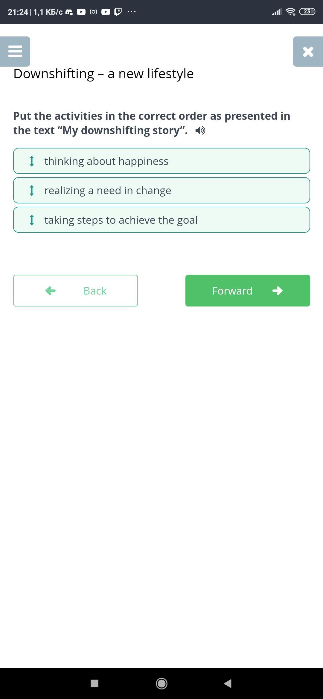 Put the activities in the correct order as presented in the text “My downshifting story”.