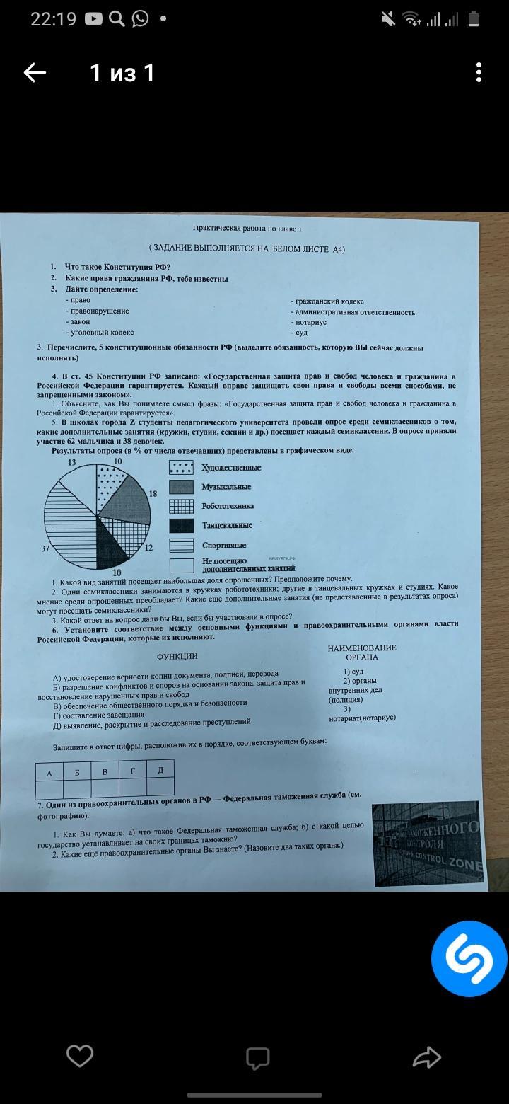 7. 1) Федеральная таможенная служба-орган государственной власти, осуществляющий контроль и надзор в области обеспечения перемещения товаров и транспортных средств через государственную границу. Таможня предотвращает попадание на территорию страны запрещенных товаров.
