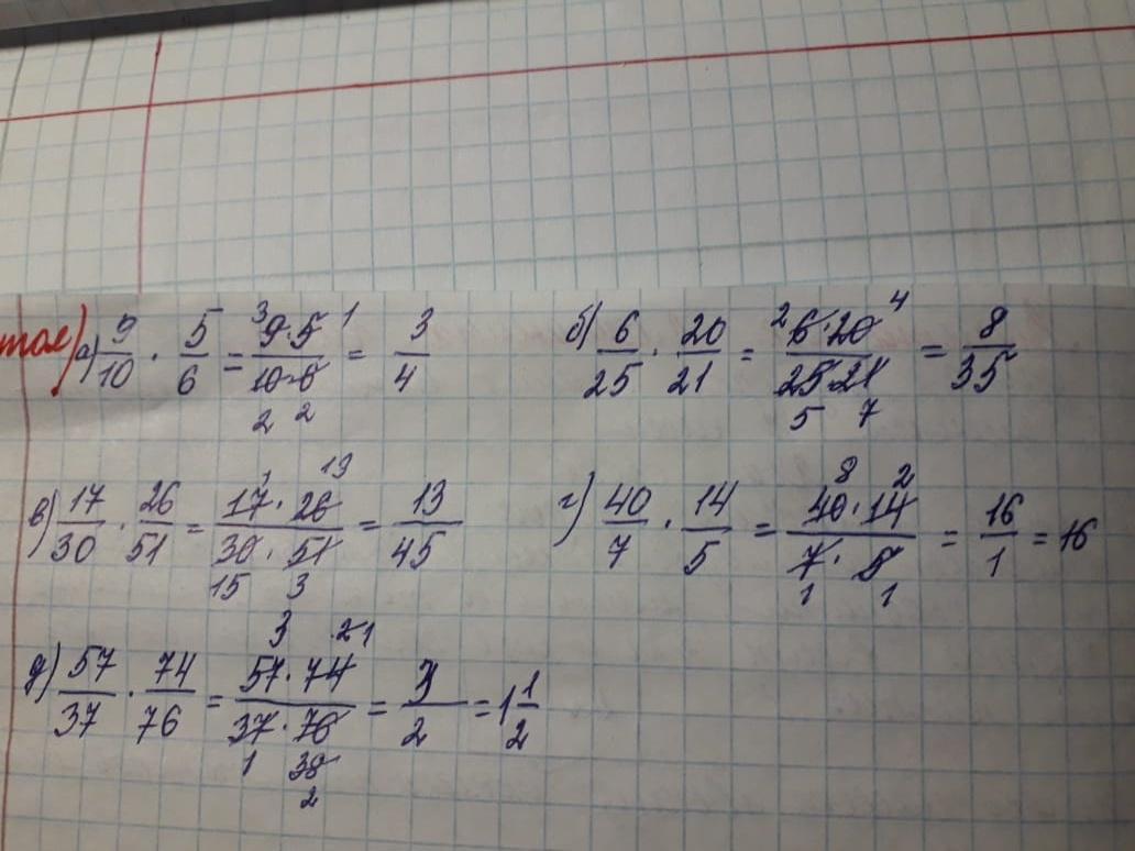 a) 5и 10 сокращаются рядом пишим 2, 9и6скоращается на 3 рядом 9пишем три а рядом с 6пишем 2Тогдв на верху осоется 3а с низу 2*2=4 и получается 3/4