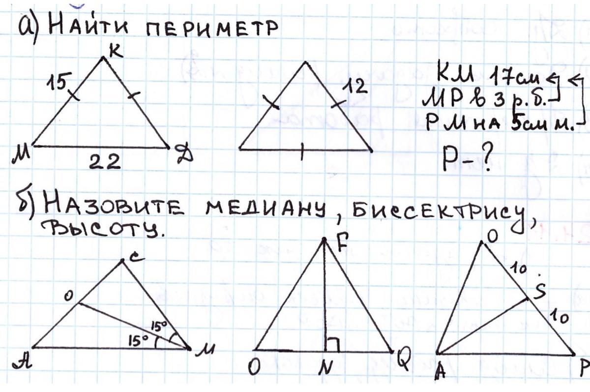 б)в первом треугольнике биссектриса, тк угол поделён пополам. во втором треугольнике высота, тк образуется прямой угол. в третем треугольнике медиана, потому что сторона к которой она проведена поделена пополам