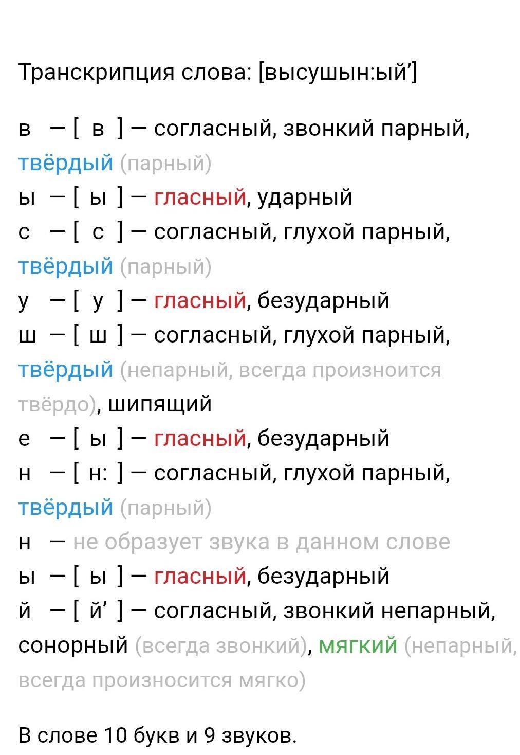 Фонетический (звуко-буквенный) разбор слова«вы́сушенный». вы́сушенный→[высушын:ый']. В слове «вы́сушенный»: слогов—4 (вы-су-ше-нный), букв—10, звуков—9: