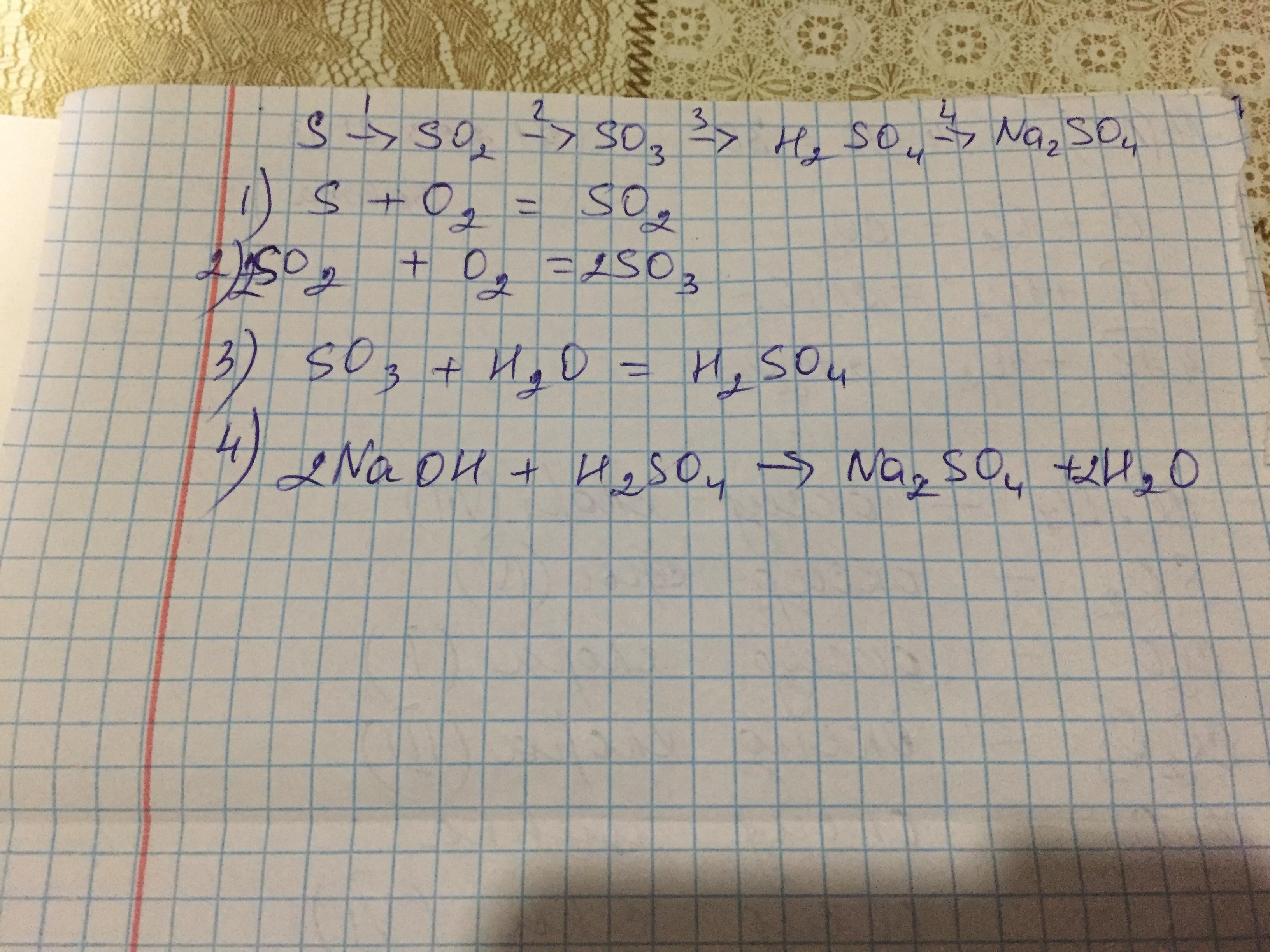 Напишите уравнение реакций, с помощью которых можно получить следующие превращения: S->SO2->SO3->H2SO4->Na2SO4 СРОЧНО ‼‼‼