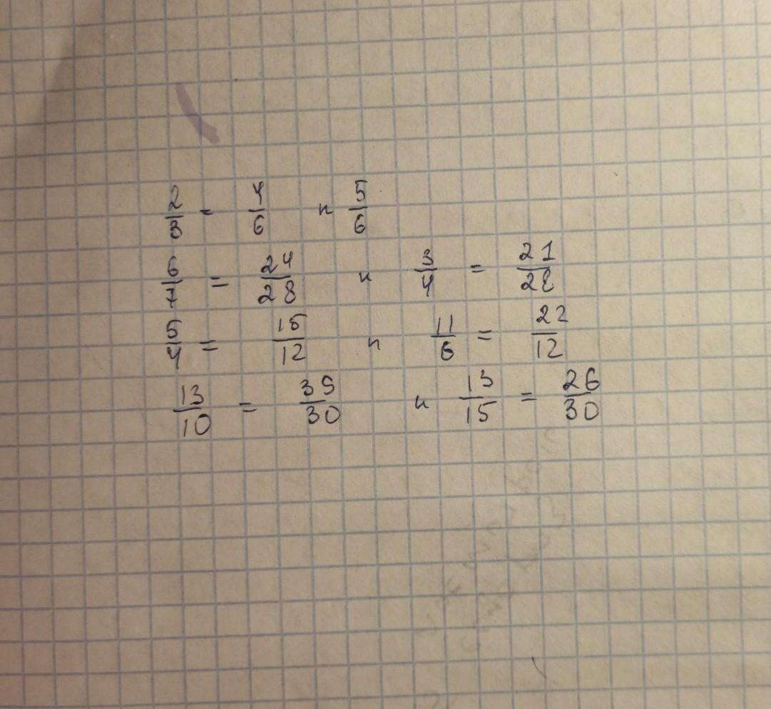 Вот например 2 /3 ты умножаешь числитель (сверху) и знаменатель на 2 у тебя получится 4/6 и 5/6