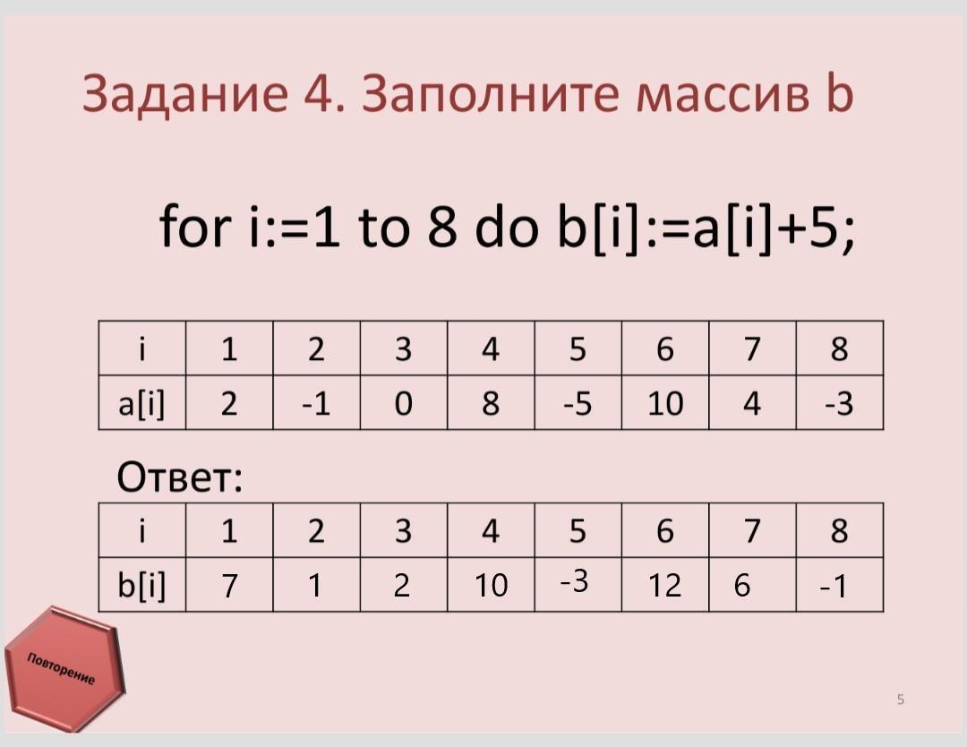 Заполнение массива B происходит через выражение a[i] + 5, где i - индексы элементов массива А.