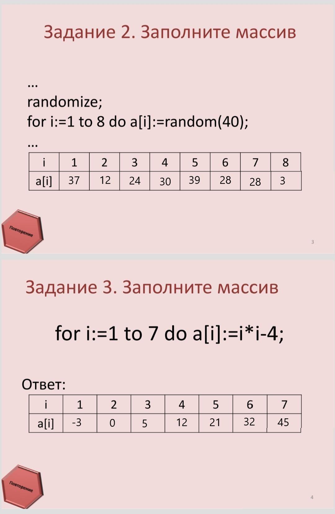 Заполнение массива происходит через выражение i × i - 4, где i - индексы элементов массива А.