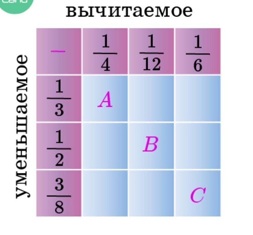 Используя таблицу више найди числовые значения A , B , C. 7/12 ; 7/12 ; 7/24 1/24 ; 7/24 ; 5/12 1/12 ; 5/12 1/12 ; 7/12 ; 7/24 . Пожалуйста срочно!!!