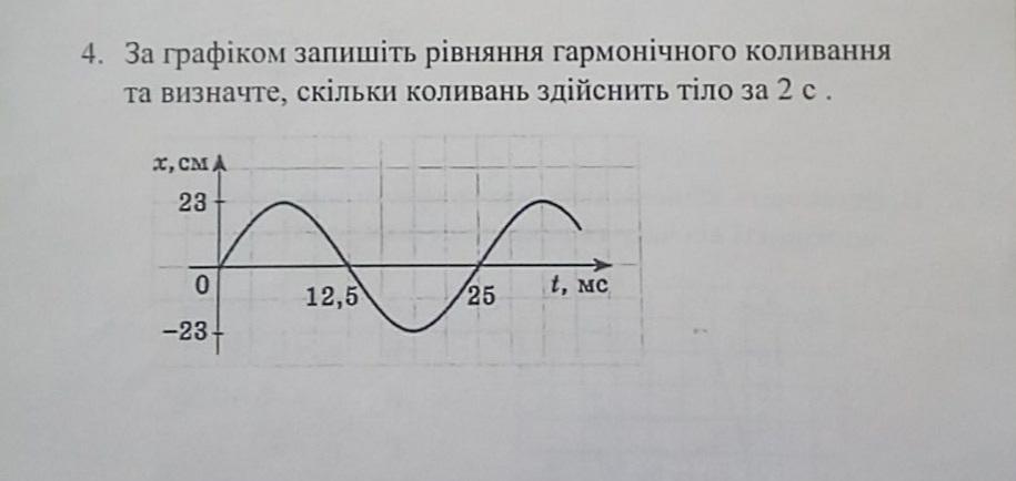 За графіком запишіть рівняння гармонічного коливання та визначте, скільки коливань здійснить тіло за 2 с.