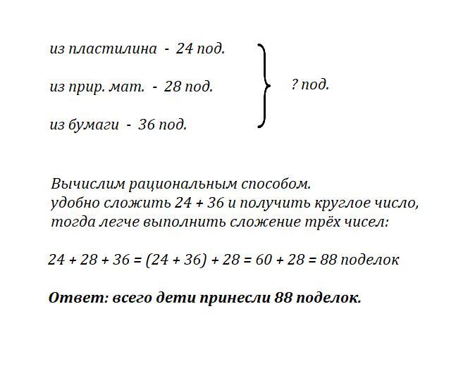 Выбери рациональный способ решения задачи. Запиши ответ. Ученики принесли на выставку детского творчества 24 поделки из пластилина, 28 – из природного материала, 36 – из бумаги. Сколько всего поделок принесли дети?