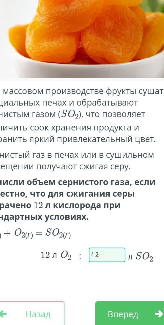 Вычисли объем сернистого газа, если известно, что для сжигания серы потрачено 12 л кислорода при стандартных условиях.