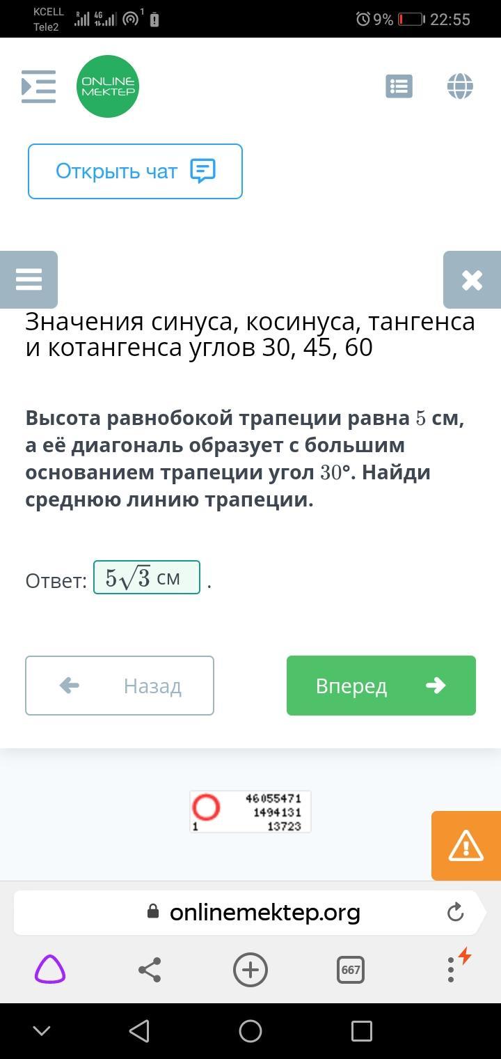 Высота равнобокой трапеции равна 5 см, а её диагональ образует с большим основанием трапеции угол 30°. Найди среднюю линию трапеции.