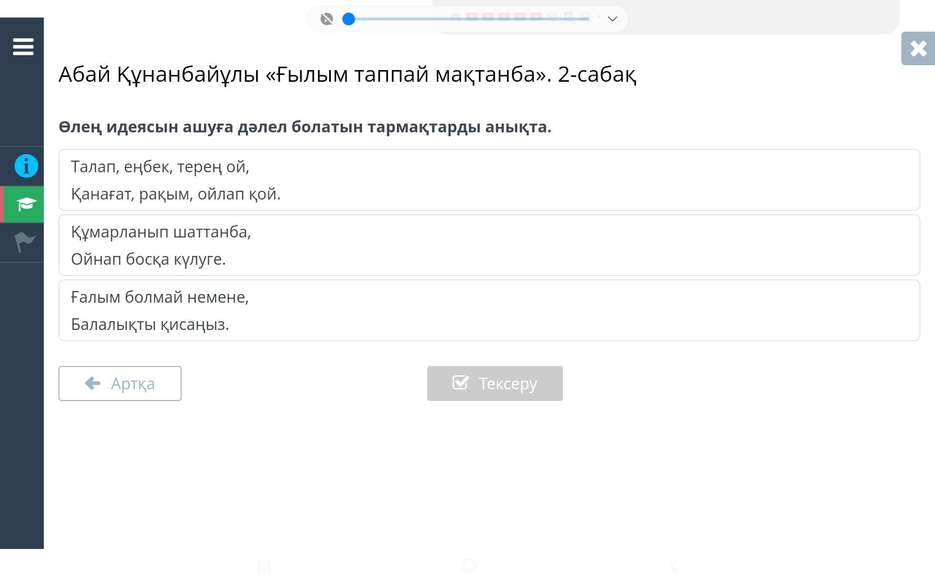 Өлең идеясын ашуға дәлел болатын тармақтарды анықта. Талап, еңбек, терең ой, Қанағат, рақым, ойлап қой. Құмарланып шаттанба, Ойнап босқа күлуге. Ғалым болмай немене, Балалықты қисаңыз. Пж комек