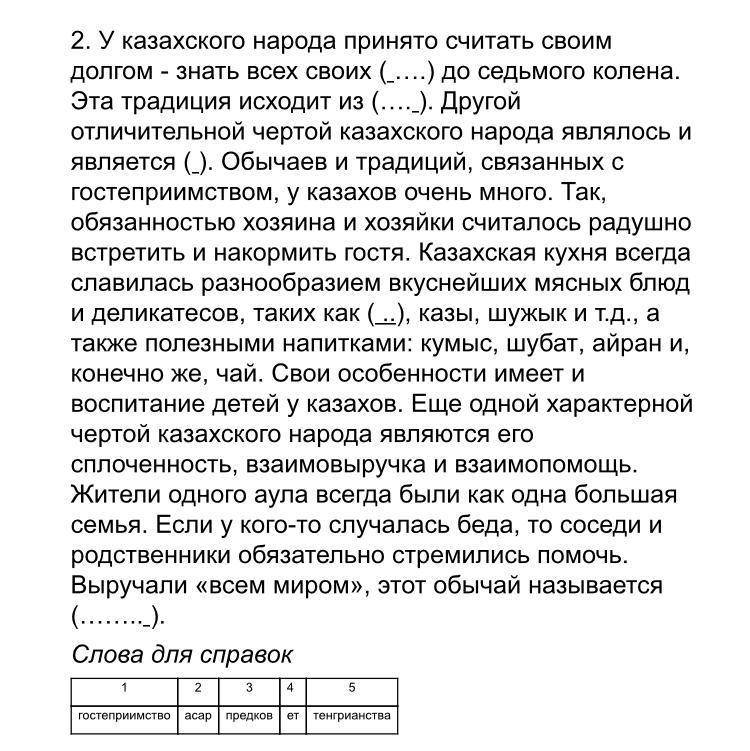 Другой отличительной чертой казахского народа являлось и является (________________). У казахского народа существуют множество пословиц и поговорок связанных с гостеприимством, одна из которых переводится, как "Если гость приходит, счастье в дом приводит!". А если в гости приходил ребенок, то его обязательно угощали чем-нибудь вкусненьким и дарили небольшой подарок. Существовало поверье, что если ребенок уйдет из гостей расстроенный, то заберет с собой (_____________) из дома.