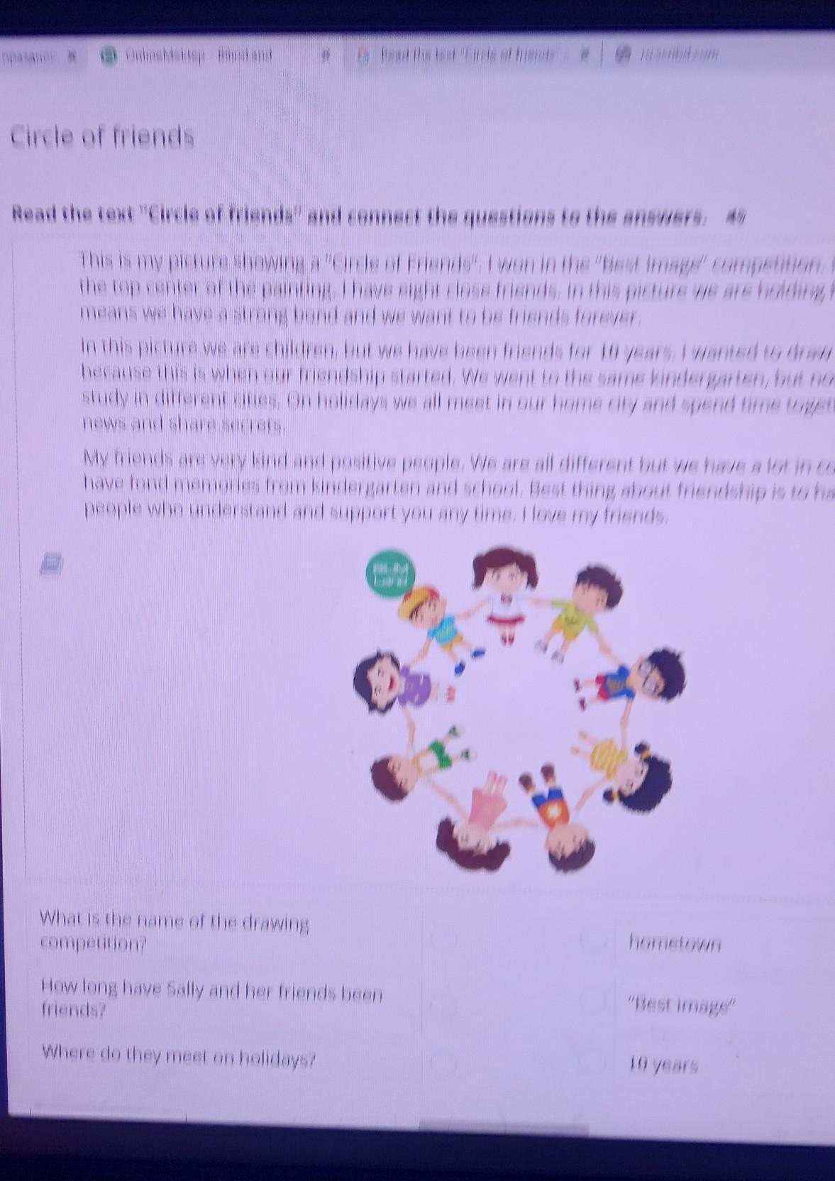 Read the text "Circle of friends" and connect the questions to the answers.)
