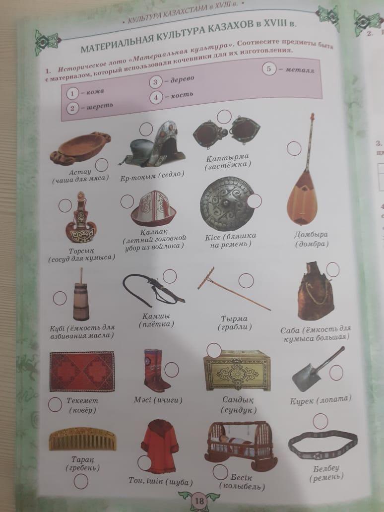 Из кожи седло, сосуд для кумыса, плётка, ёмкость для кумыса большая, ремень.