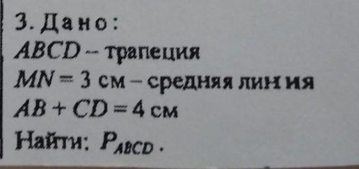 дано: трапеция ABCD. MN-3 см- средняя линия, АВ+СD= 4см. Найти периметр P(ABCD)-?