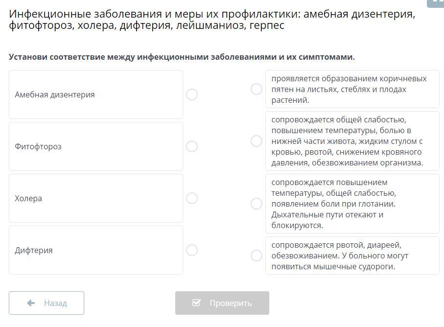 Установи соответствие между инфекционными заболеваниями и их симптомами.
