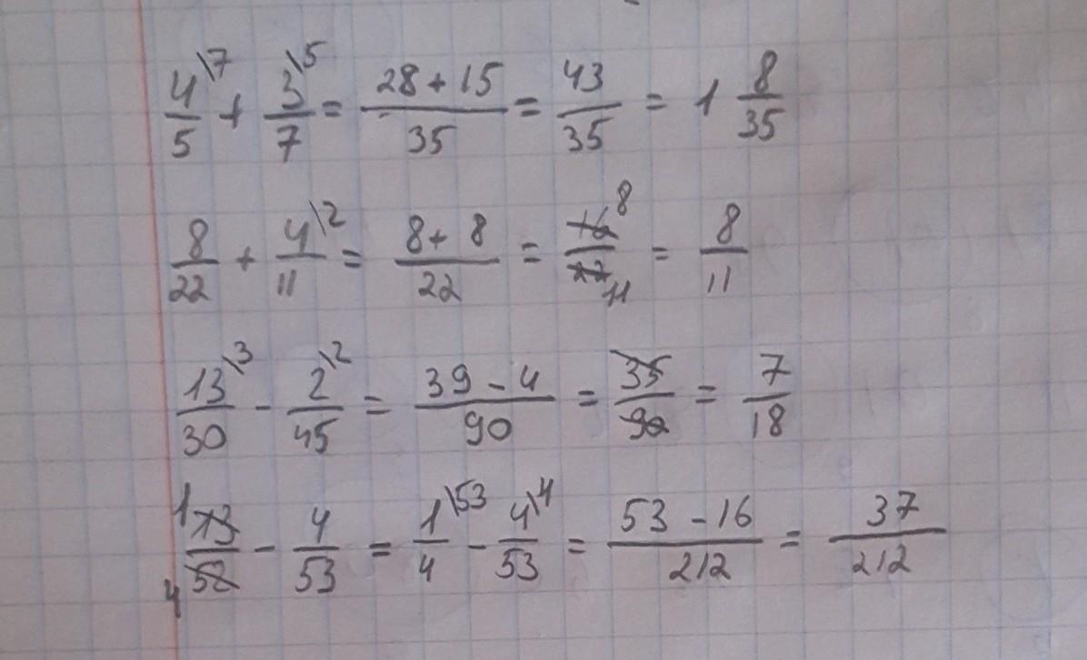 Найди значение выражения 4/5+3/7, 8/22+4/11, 13/30-2/45, 13/52-4/53