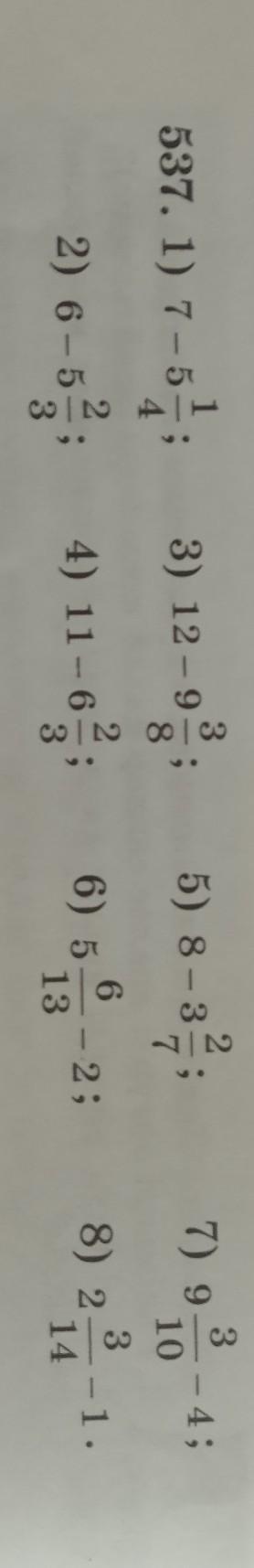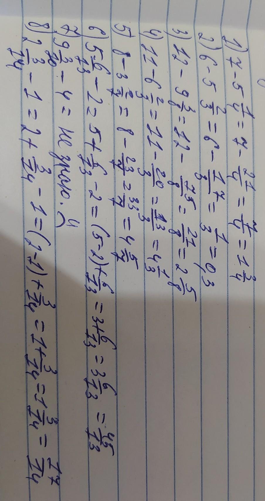 1)7-5 1/4=6 4/4- 5 1/4=1 3/4 3)12-9 3/8=11 8/8-9 3/8=2 5/8 5)8-3 2/7= 7 7/7-3 2/7=4 5/7 7)9 3/10-4=5 3/10