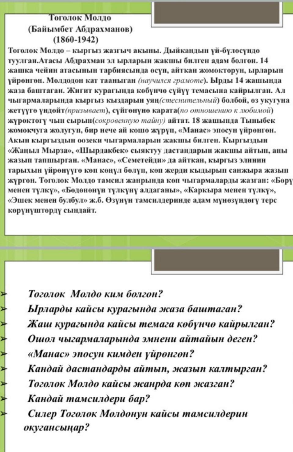 1) Тоголок Молдо- кыргыз жазгыч акын болгон.