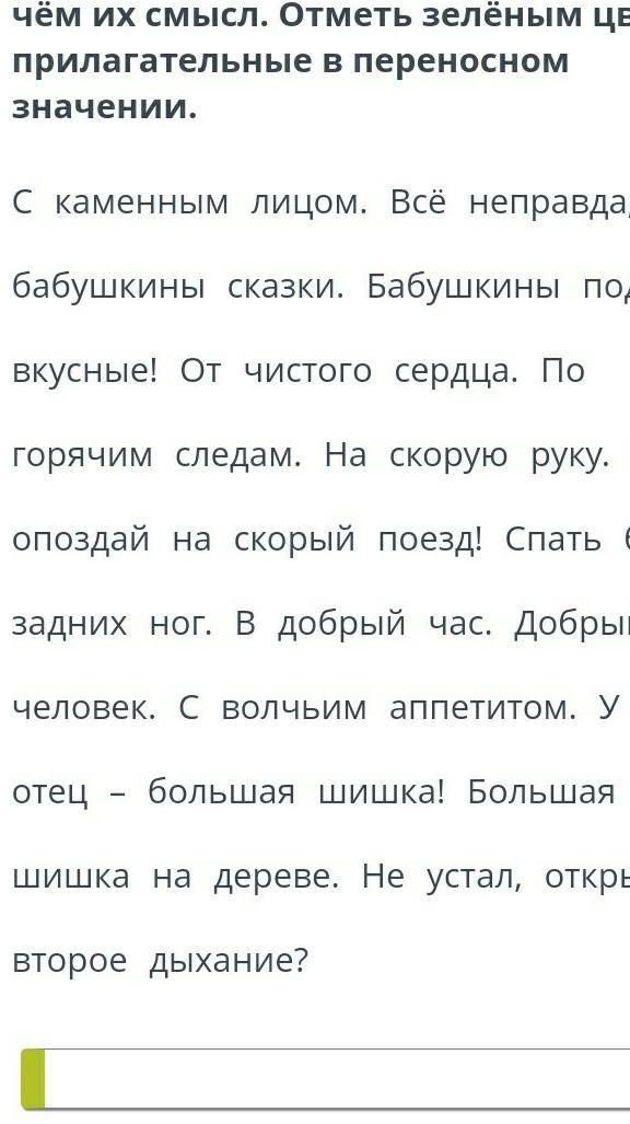 Прочитай фразеологизмы. Подумай, в чём их смысл. Отметь зелёным цветом прилагательные в переносном значении.