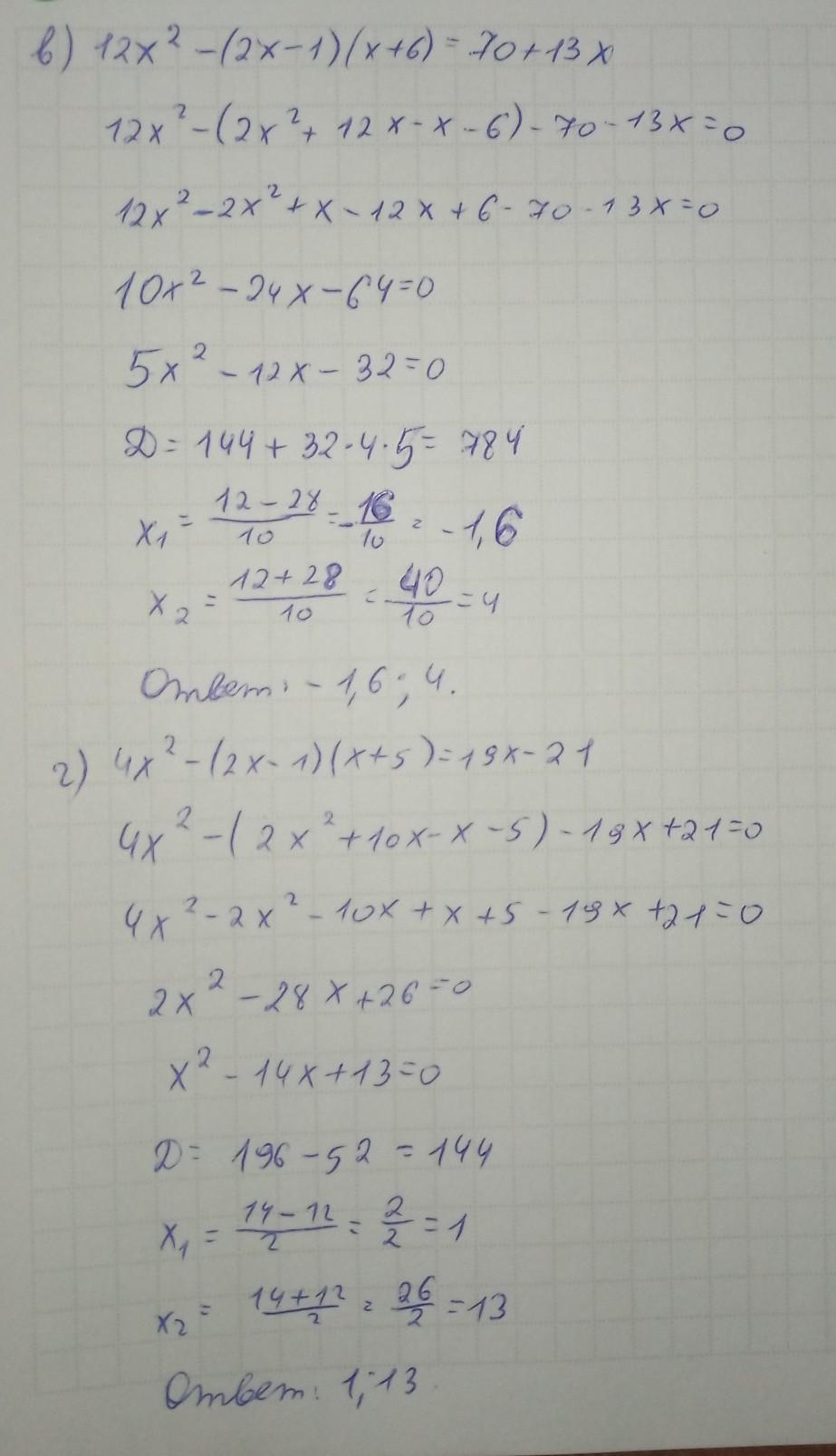 в) 12х^2 - (2x-1)(х + 6) = 70 + 13х;