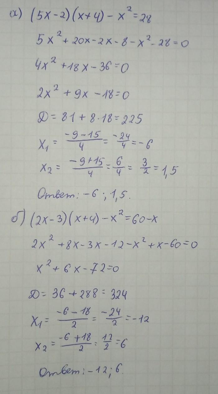 а) (5x - 2)(х + 4) - х^2 = 28;