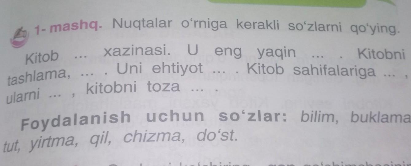 Kitob bilim xazinasi.U eng yaqin do'st.Kitobni tashlama, yirtma.Uni ehtiyot qil.