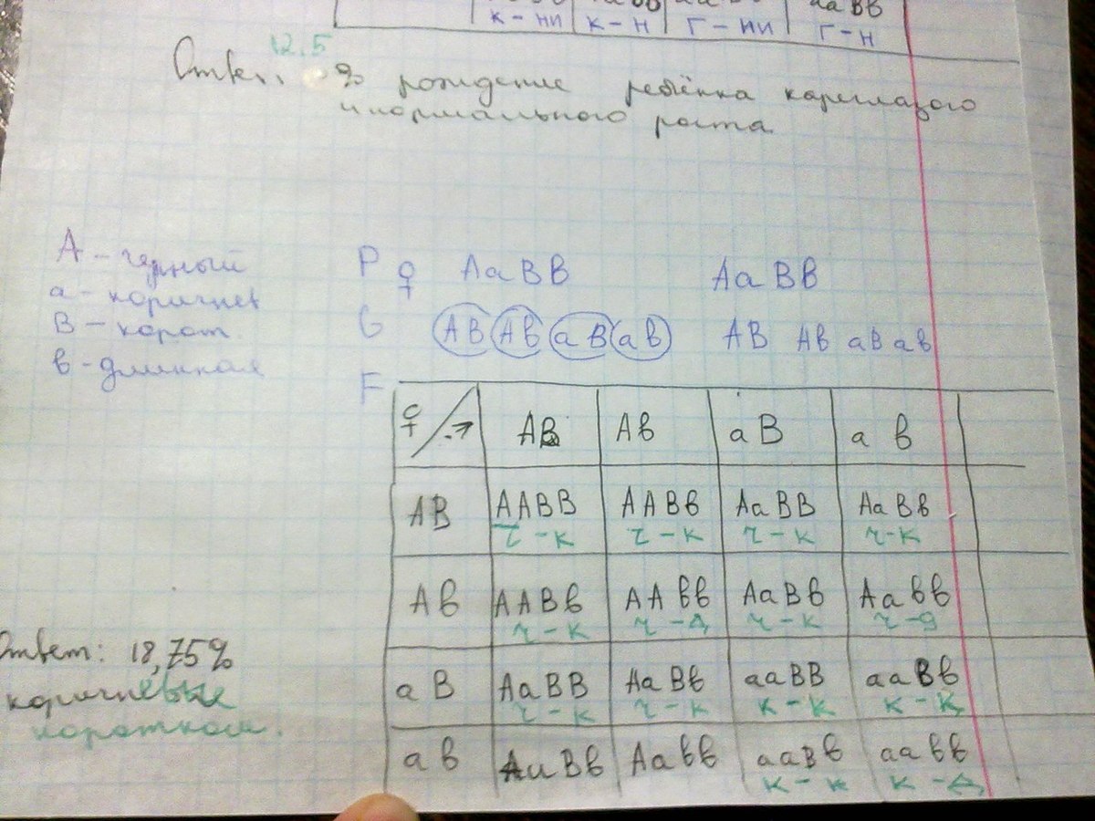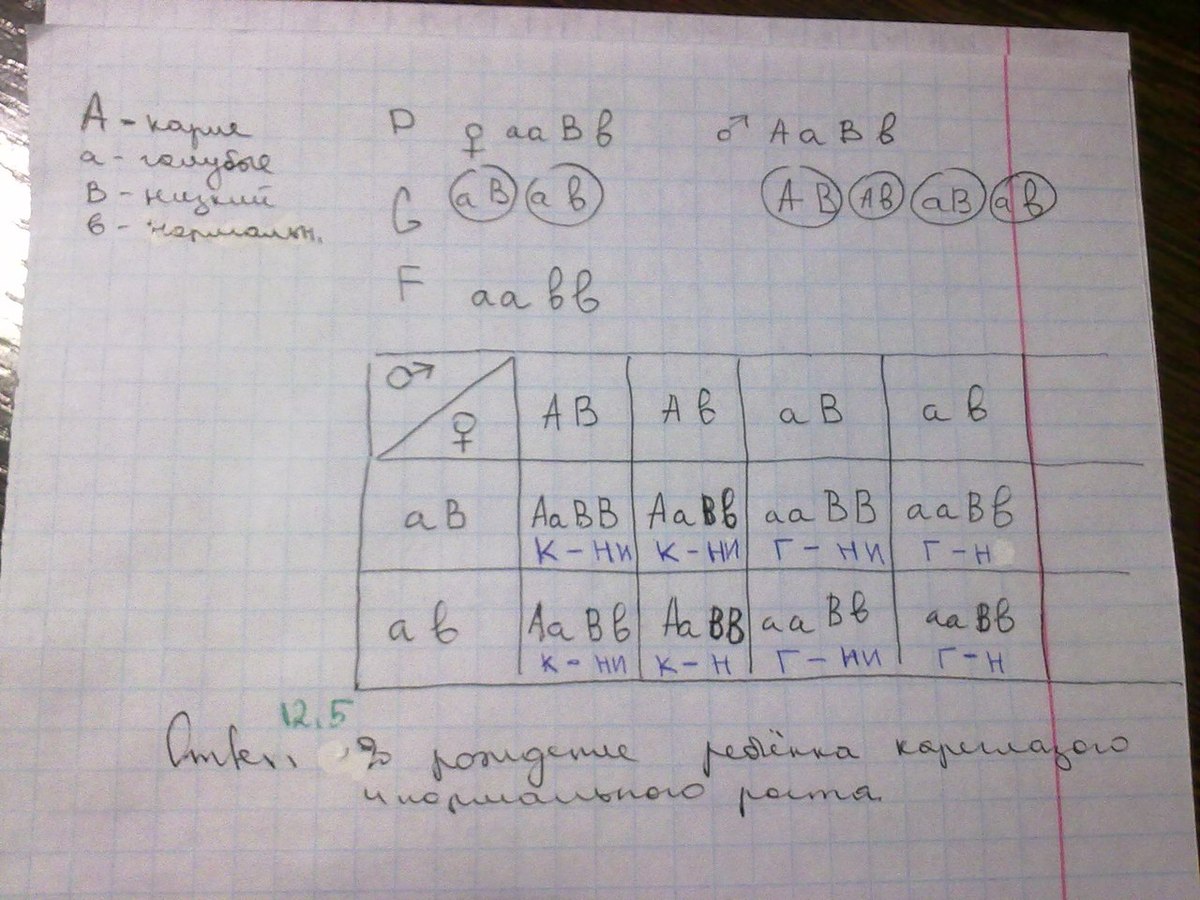 определите вероятность рождения в семье кареглазых детей нормального роста, если известно следующие: жена была голубоглазой низкорослой; отец имел карие глаза и низкий рост, его родители были один - голубоглазый нормального роста, а другой кареглазый и низкорослый.в этой семье уже есть один ребенок, имеющий нормальный рост и голубые глпза. низкий рост и карие глаза доминантный признак.