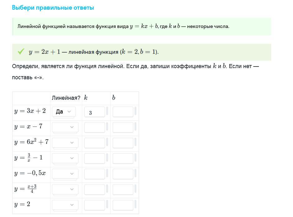 Линейной функцией является функция вида y=kx+b где k u b некоторые числа