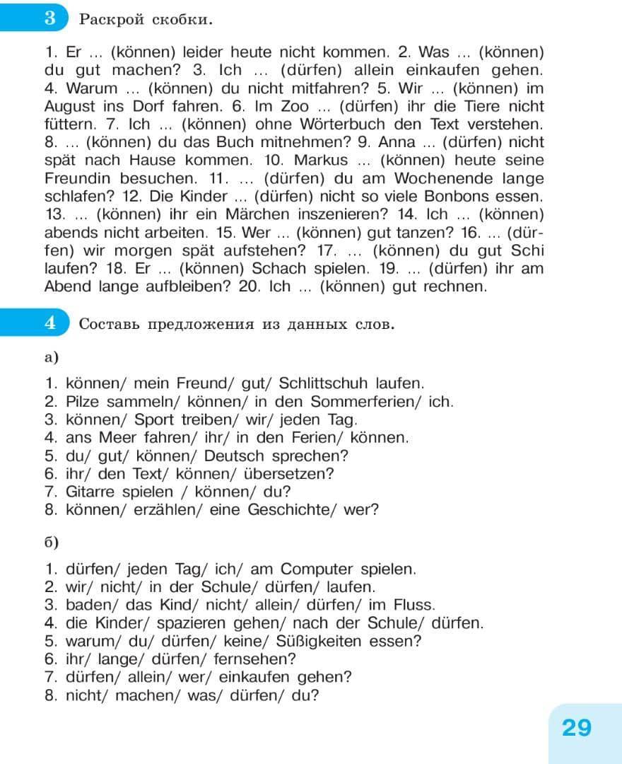Er ... (können) leider heute nicht kommen. 2. Was ... (können) du gut machen? 3. Ich ... (dürfen) allein einkaufen gehen. 4. Warum ... (können) du nicht mitfahren? 5. Wir ... (können) im August ins Dorf fahren. 6. Im Zoo ... (dürfen) ihr die Tiere nicht füttern. 7. Ich ... (können) ohne Wörterbuch den Text verstehen. 8. ... (können) du das Buch mitnehmen? 9. Anna ... (dürfen) nicht spät nach Hause kommen. 10. Markus ... (können) heute seine Freundin besuchen. 11. ... (dürfen) du am Wochenende lange schlafen? 12. Die Kinder ... (dürfen) nicht so viele Bonbons essen. 13. ... (können) ihr ein Märchen inszenieren? 14. Ich ... (können) abends nicht arbeiten. 15. Wer ... (können) gut tanzen? 16. ... (dür- fen) wir morgen spät aufstehen? 17. ... (können) du gut Schi laufen? 18. Er ... (können) Schach spielen. 19. ... (dürfen) ihr am Abend lange aufbleiben? 20. Ich ... (können) gut rechnen. 4 Составь предложения из данных слов. a) 1. können/ mein Freund/ gut/ Schlittschuh laufen. 2. Pilze sammeln/ können/ in den Sommerferien/ ich. 3. können/ Sport treiben/ wir/ jeden Tag. 4. ans Meer fahren/ ihr/ in den Ferien/ können. 5. du/ gut/ können/ Deutsch sprechen? 6. ihr/ den Text/ können/ übersetzen? 7. Gitarre spielen / können/ du? 8. können/ erzählen/ eine Geschichte/ wer? б) 1. dürfen/ jeden Tag/ ich/ am Computer spielen. 2. wir/ nicht/ in der Schule/ dürfen/ laufen. 3. baden/ das Kind/ nicht/ allein/ dürfen/ im Fluss. 4. die Kinder/ spazieren gehen/ nach der Schule/ dürfen. 5. warum/ du/ dürfen/ keine/ Süßigkeiten essen? 6. ihr/ lange/ dürfen/ fernsehen? 7. dürfen/ allein/ wer/ einkaufen gehen? 8. nicht/ machen/ was/ dürfen/ du?