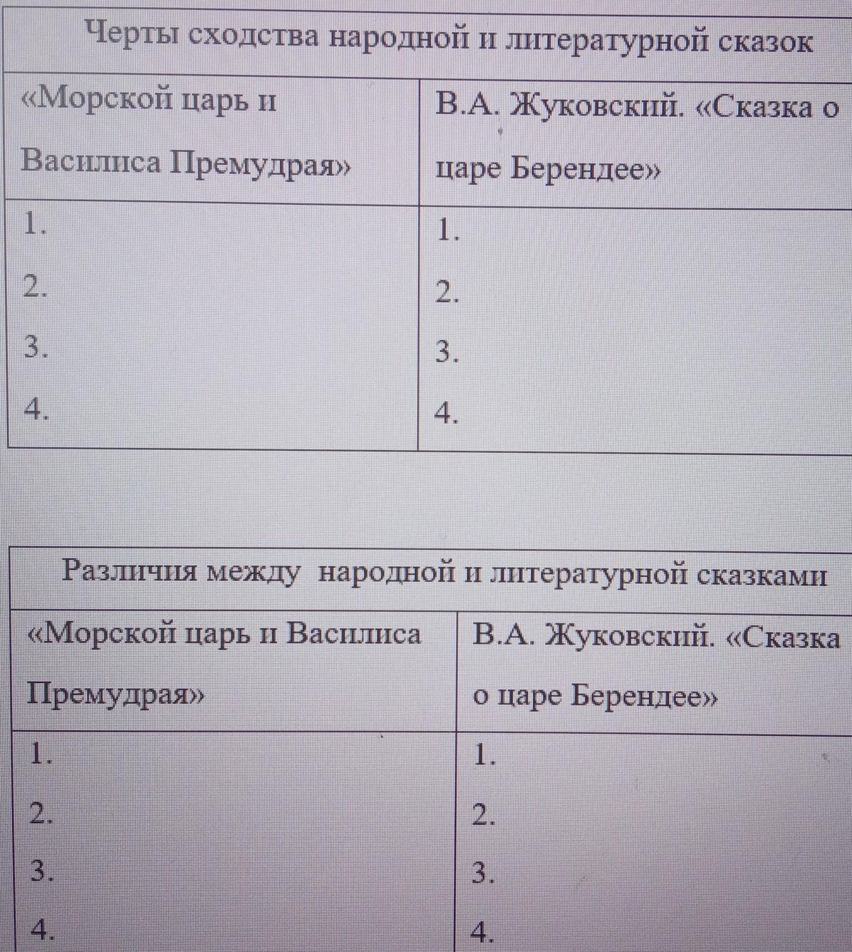 3. Заполнить таблицы: - «Черты сходства народной и литературной сказок»; «Различия между