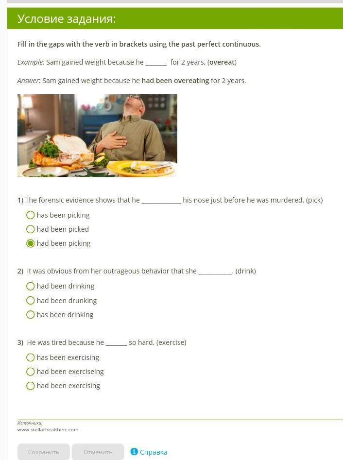 2) had been drinking 3) had been exercising
