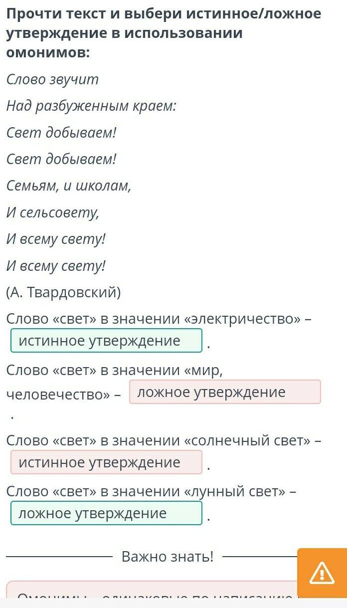 текст и выбери истинное/ложное утверждение в использовании омонимов: